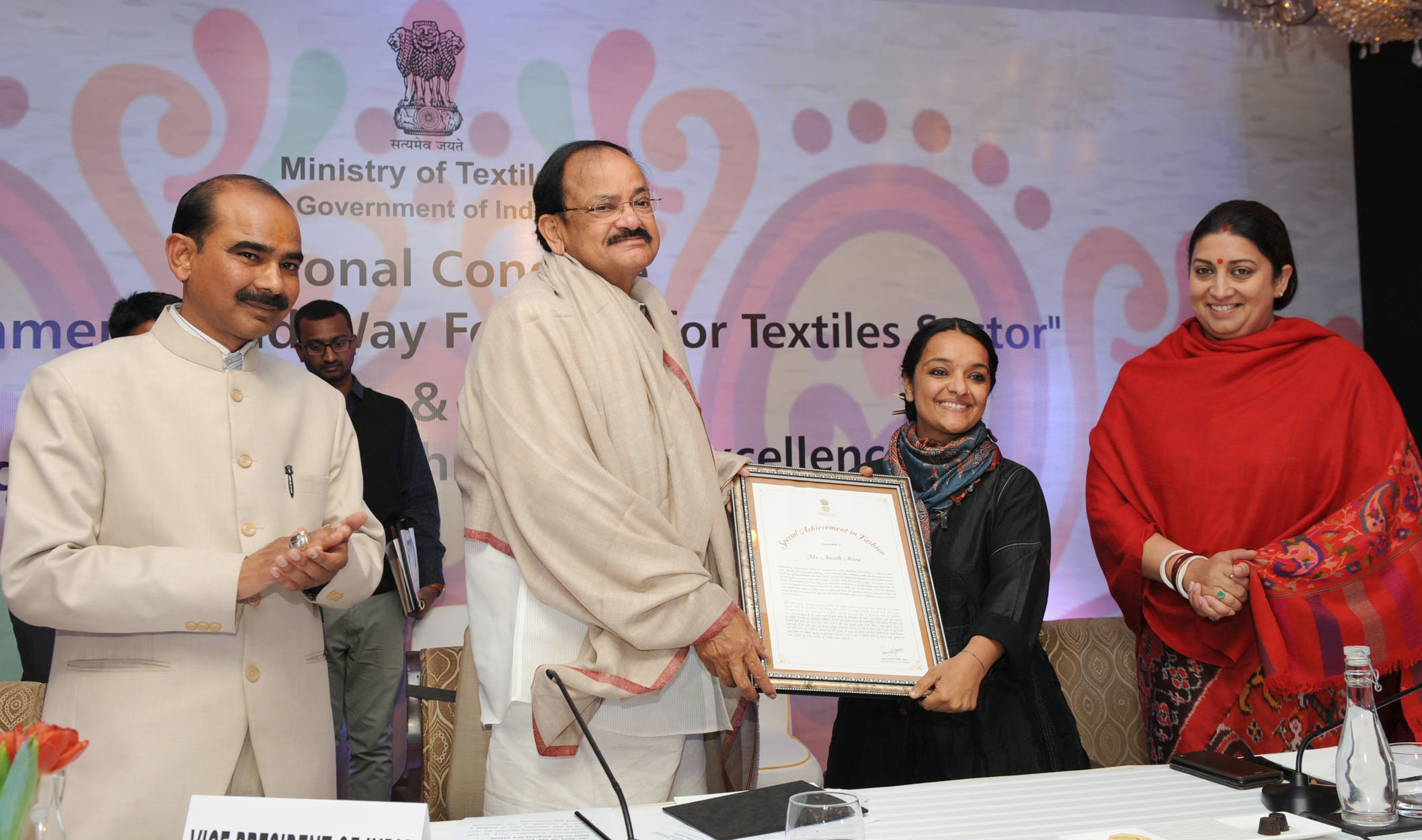 The Vice President, Shri M. Venkaiah Naidu presenting the Threads of Excellence Awards, at the outreach event on Accomplishments and Way Forward for Textile Sector, in New Delhi on January 06, 2019.The Union Minister for Textiles, Smt. Smriti Irani and the Minister of State for Textiles, Shri Ajay Tamta are also seen.[/caption] Among the awardees were FDCI Board Members:
